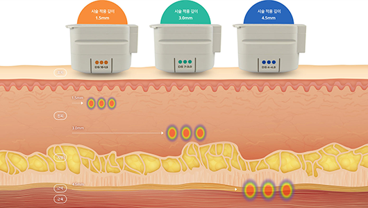 ウルセラ専用チップは、1.5mm・3.0mm・4.5mmなど、さまざまな深さをターゲットにして、真皮層からSMAS層まで繊細に超音波エネルギーを伝達します。